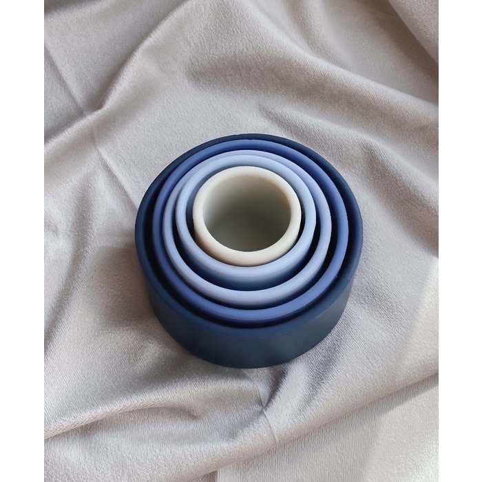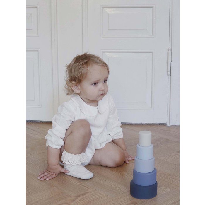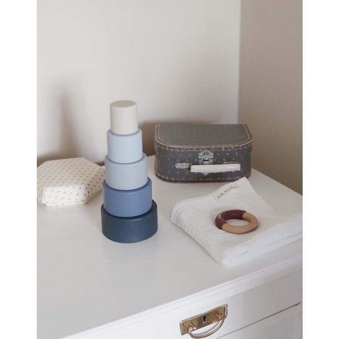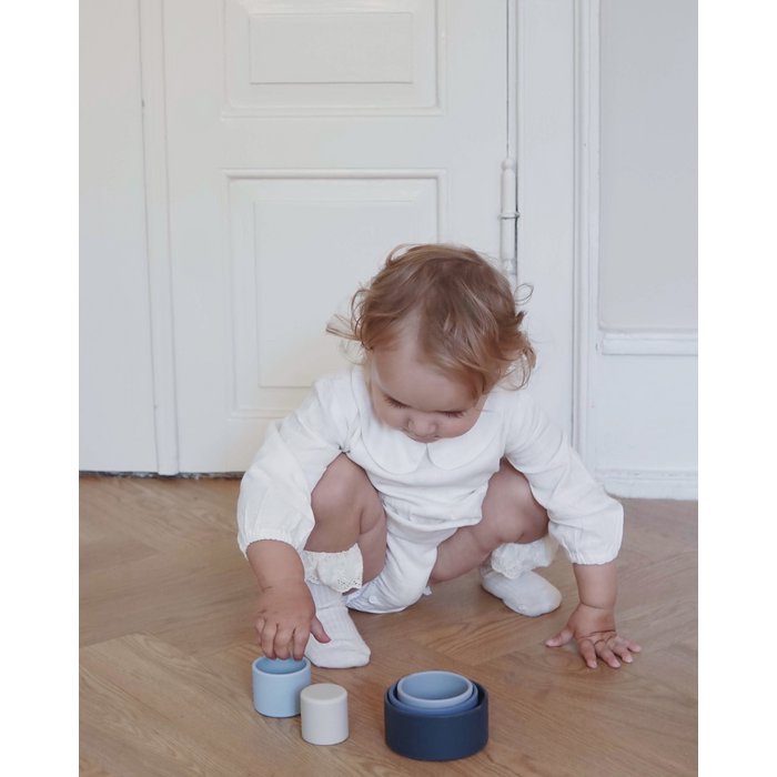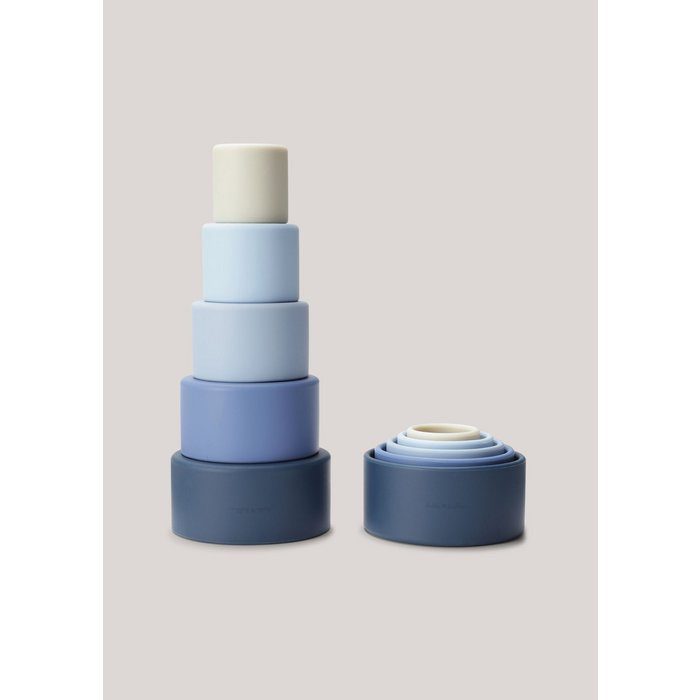 De siliconen stapelbekers kunnen uw baby of peuter creativiteit bieden. Onze siliconen stapelbekers worden geleverd in vijf bekers in blauwe tinten. Gemaakt van zachte 100% food-grade siliconen, kalmeren onze niet-giftige en knabbelbare siliconen bijtringen de groeiende tanden en het tandvlees van je baby terwijl ze hun geest nieuwsgierig en creatief houden. Ongeacht de leeftijd van je kleintje, ze vinden het leuk om vormen, maten en kleuren te leren, problemen op te lossen en organisatie- en motoriek te ontwikkelen tijdens het bouwen met onze stapelbare bekers. Onze stapelbekers zijn gemakkelijk schoon te maken en verdragen vaatwassers, magnetrons, ovens en vriezers. Ze hebben een hoge duurzaamheid en zijn zeer buigzaam, dankzij de flexibele siliconen. De gezondheid en veiligheid van uw baby is het belangrijkst voor ons. Daarom zijn alle Bobbi-siliconenproducten geteste siliconenproducten die voldoen aan de hoogste Europese normen voor “voedselveilige” stoffen; de strengere Duitse LFGB-norm. Al onze siliconen producten worden getest door geaccrediteerde onafhankelijke instanties. Siliconen van voedingskwaliteit kunnen een veiliger en handiger alternatief zijn voor plastic, vanwege de gemakkelijke reiniging en hygiënische eigenschappen, de veerkracht en het niet-poreuze oppervlak dat geen bacteriën toelaat.