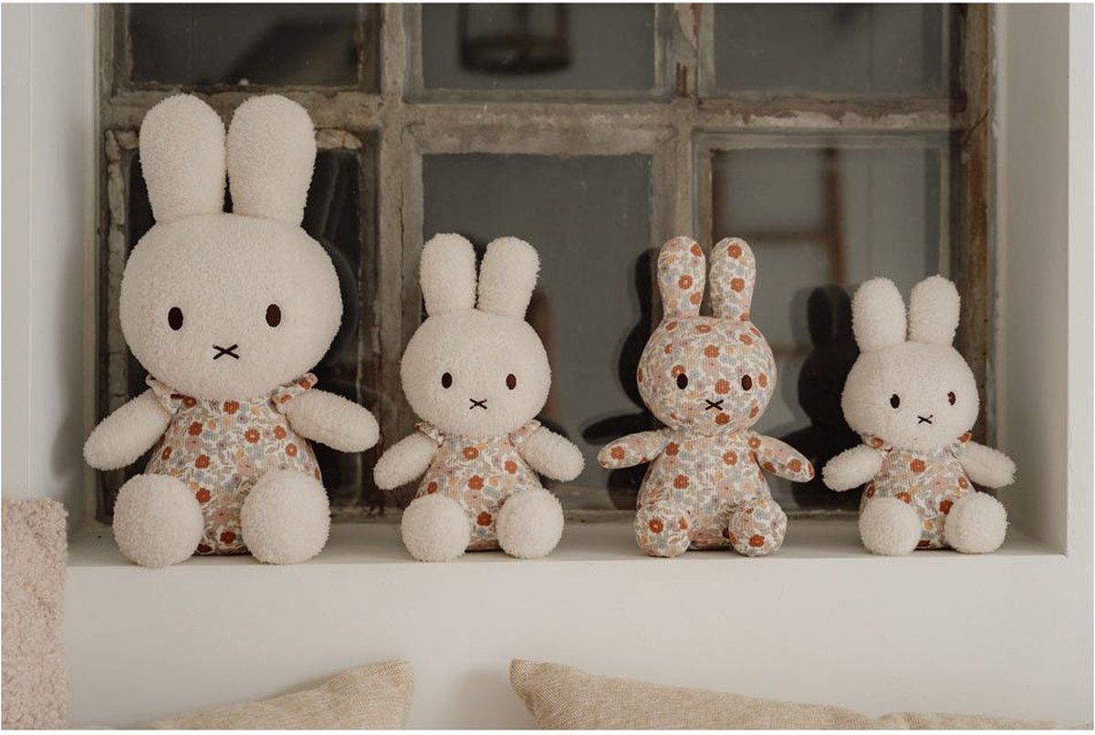 Kom geef nijntje een knuffel! Ze is zacht en lief, en deelt heel graag knuffels uit. Tijdens het spelen, onderweg of als het bedtijd is, ze is er altijd voor je. Nijntje is gemaakt van zacht pluche en geprint corduroy en is 35 cm lang. De prachtige nieuwe outfit van dit beroemde konijntje is versierd met Vintage Little Flowers, ontworpen door Little Dutch. Een mooie look voor de babykamer!