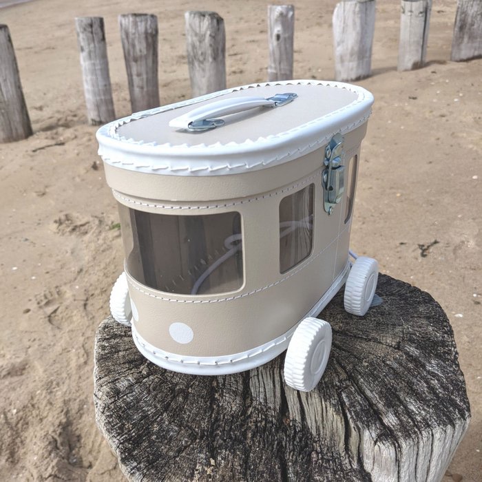 Deze tram in zandkleur is een echte musthave! Het is multifunctioneel. Leuk om mee te spelen, spulletjes in op te bergen en natuurlijk staat die geweldig op een plankje in de kinderkamer. Het heeft een touwtje, zo kan de tram als trekspeeltje gebruikt worden. De wielen rijden echt! Handgemaakt.