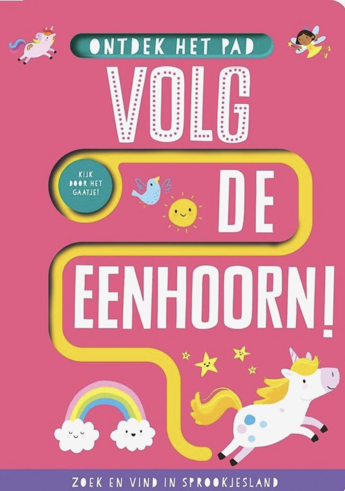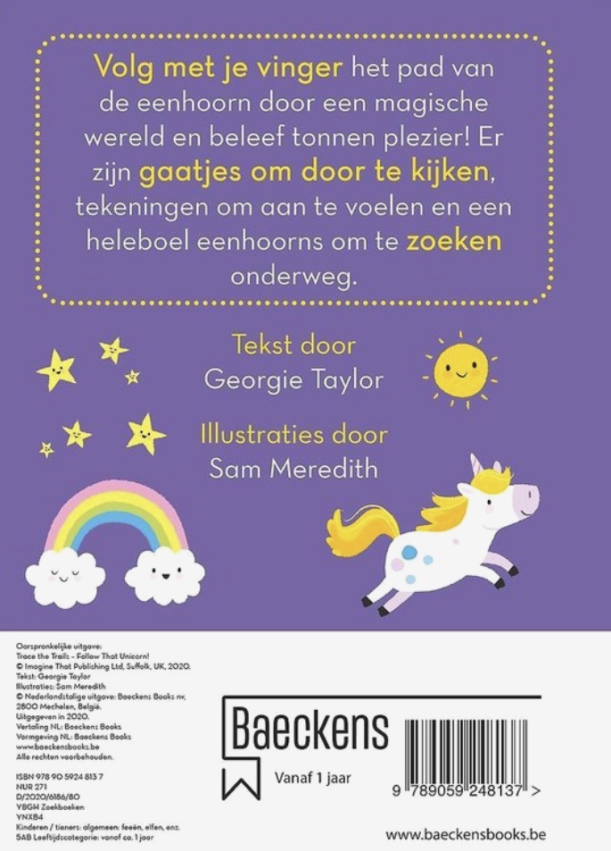 Een zoekboek voor peuters met een magisch thema! Nieuwsgierige vingertjes kunnen keer op keer het pad van de eenhoorn volgen op zijn reis door het magische sprookjesland. Ontdek reliëfelementen om aan te voelen, gaatjes om door te kijken en los de zoek-en-vind vragen op. Een lollig boekje om telkens te bekijken.